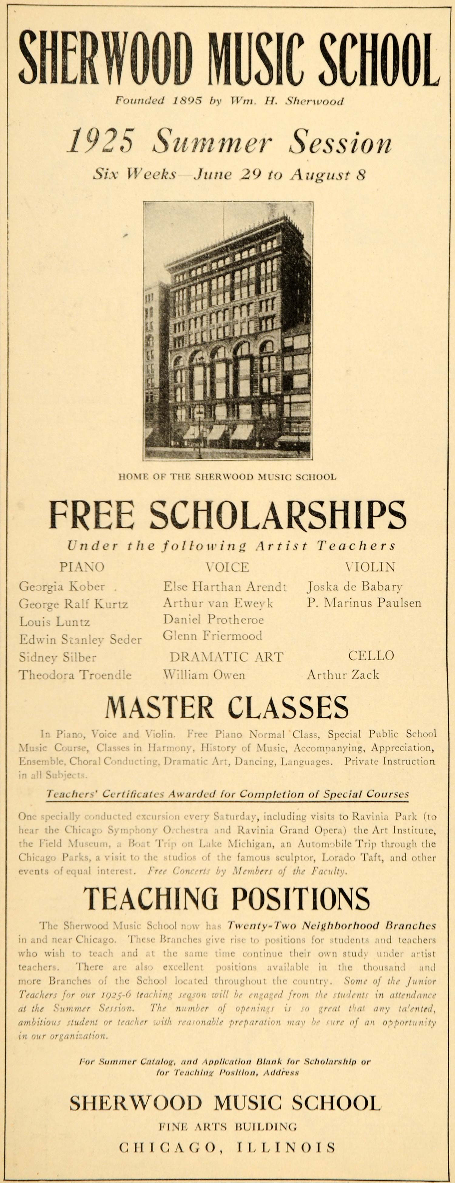 This is an original 1925 black and white print ad for the Sherwood Music School founded in 1895 by Wm. H. Sherwood and located in Chicago, Illinois. The ad is promoting the 6-week summer session.