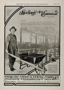This is an original 1925 black and white print ad from the Sterling Wheelbarrow Company of Milwaukee, Wisconsin for the Sterling Wheelbarrow. The ad has a nice illustration of a workman with a Sterling Wheelbarrow and a testimonial from C. H. Everitt of Buffalo, N.Y.