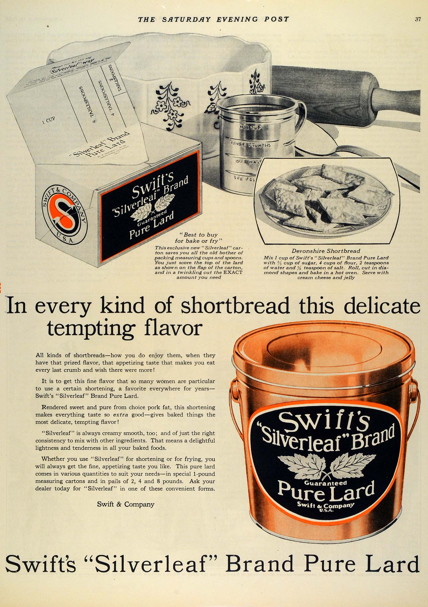 This is an original 1925 color print ad for Swift's "Silverleaf" Brand Pure Lard by Swift & Company/ This ad features a recipe for Devonshire Shortbread.