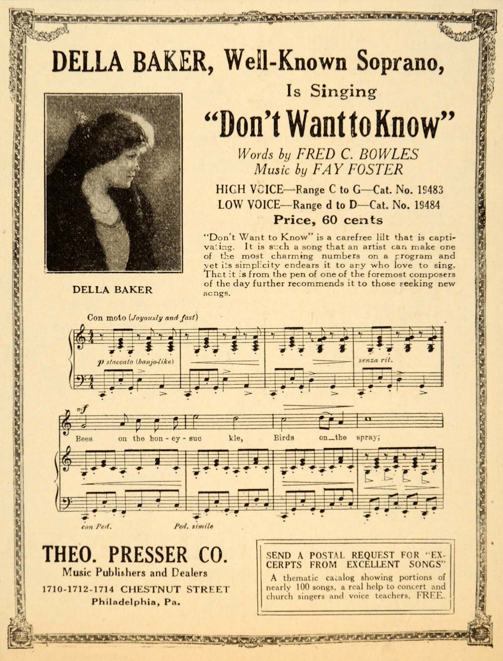 This is an original 1925 black and white print ad for Theo. Presser Co. Music Publishers and Dealers located at 1710 -1712-1714 Chestnut Street in Philadelphia, PA. The song, "Don't Want to Know", as sung by Della Baker, a soprano, is promoted in the ad and is priced at 60 cents. Words are by Fred C. Bowles and Music is by Fay Foster.