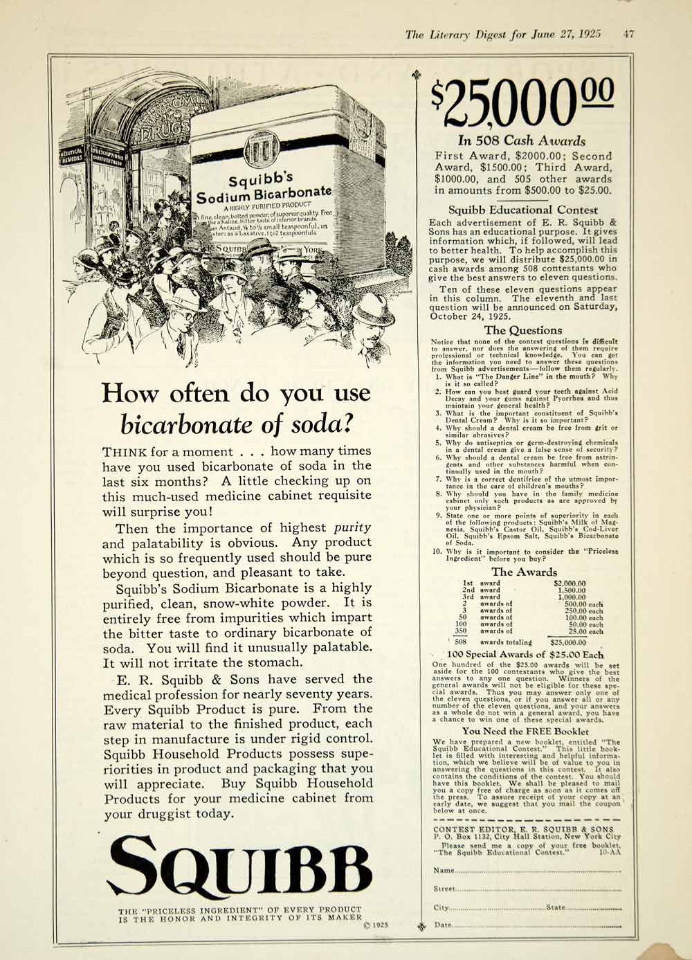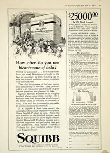 This is an original 1925 black and white print ad for Squibb's Sodium Bicarbonate.