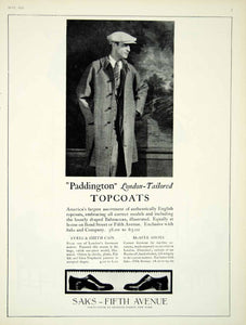 This is an original 1925 black and white print ad for "Paddington" London-Tailored topcoats, Ayres & Smith Caps, and McAfee Shoes available from Saks-Fifth Avenue, New York City.