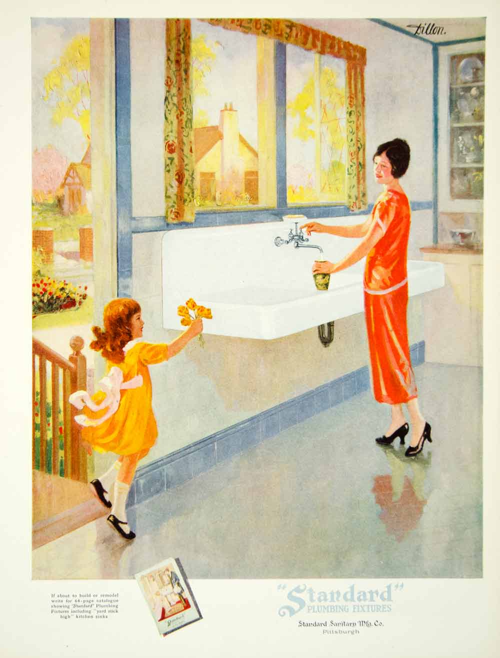 This is an original 1925 color print ad for Standard Plumbing Fixtures from the Standard Sanitary Mfg., Co., Pittsburgh, with a great illustration of a classic 1920's kitchen sink.