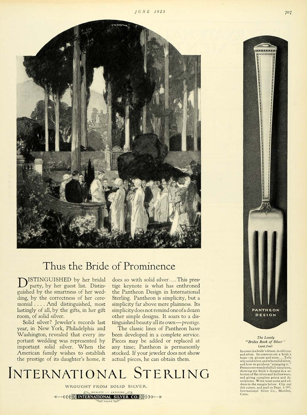 This is an original 1925 black and white print ad for the International Sterling Pantheon Design from International Silver Company.
