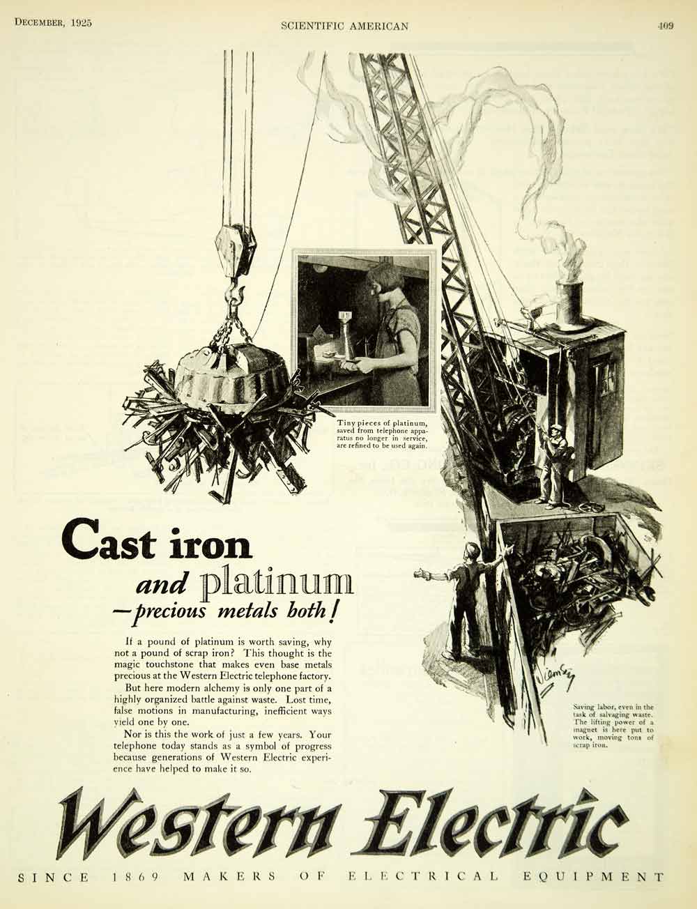 This is an original 1925 black and white print ad for Western Electric expounding their reusage, or recycling, of scap iron and platinum.