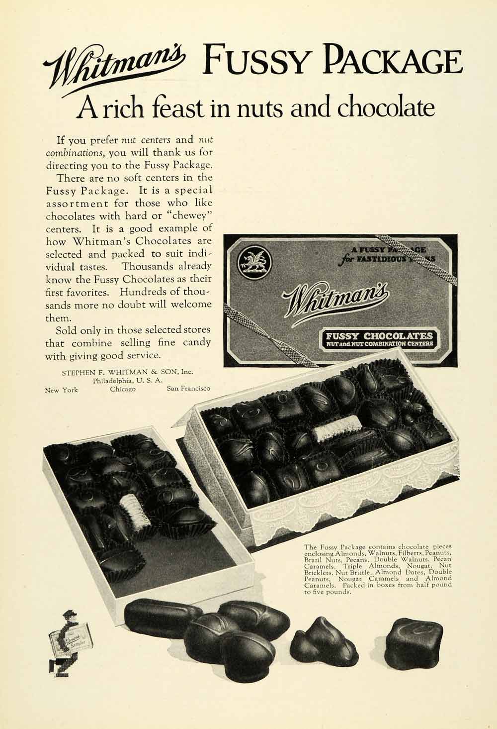 This is an original 1925 black and white print ad for Whitman's Fussy Chocolates.