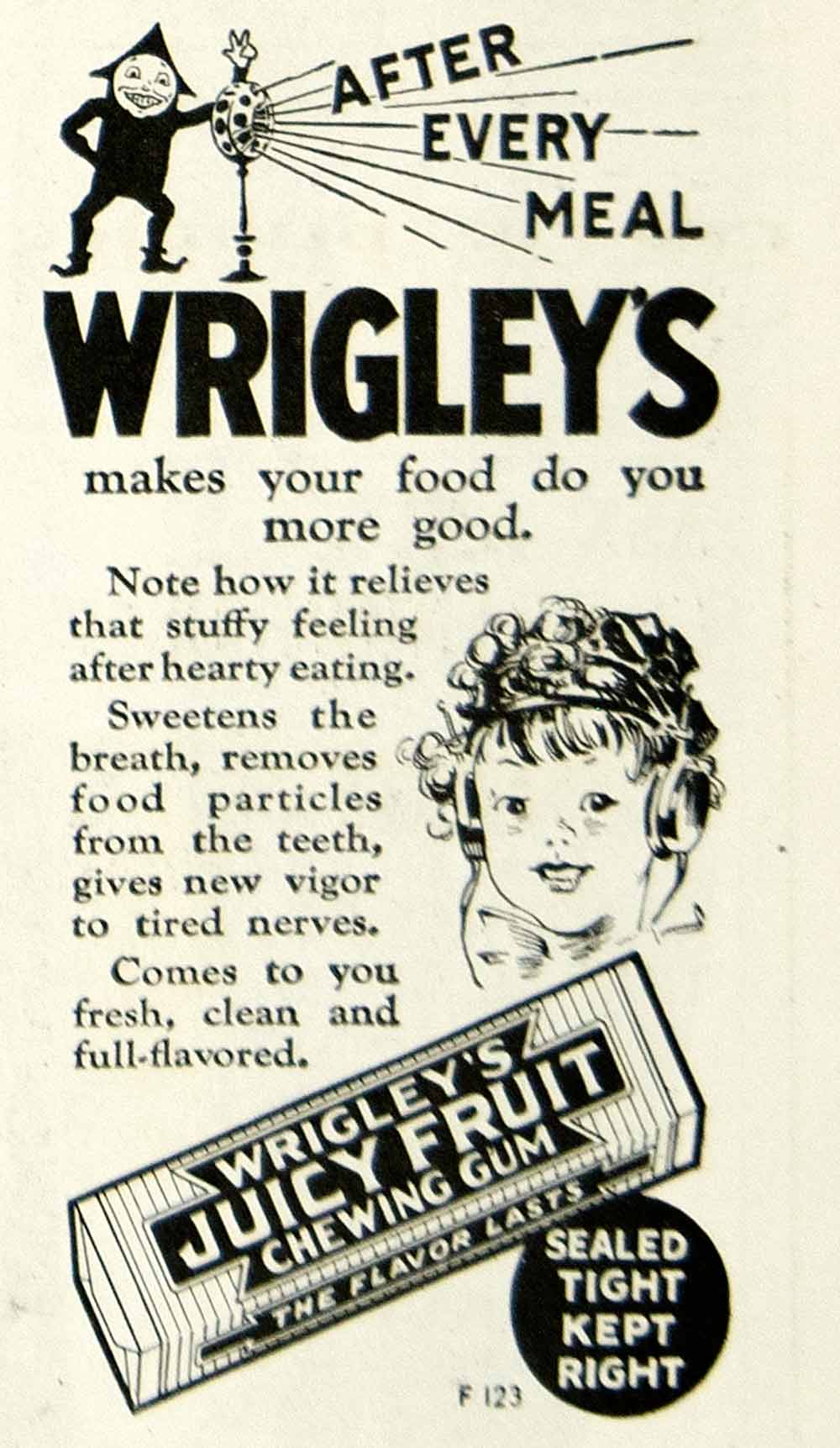 This is an original 1925 black and white print ad for Wrigley's Juicy Fruit chewing gum that was made and sold during the Roaring Twenties era.