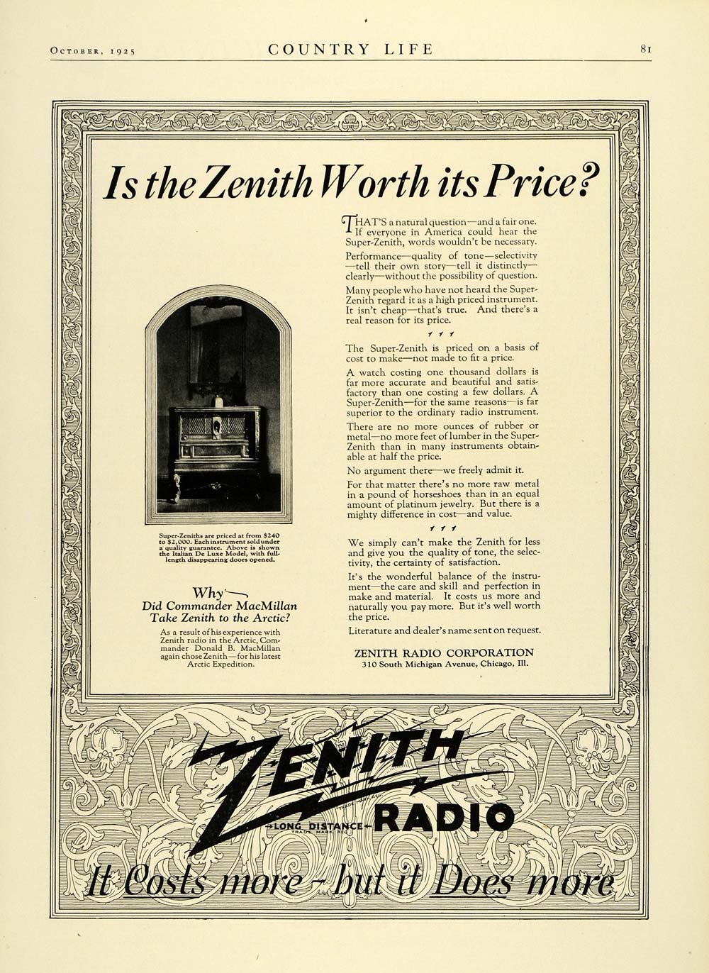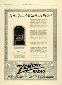 This is an original 1925 black and white print ad for the Zenith Radio from Zenith Radio Corporation lcoated at 310 South Michigan Avenue, Chicago, Illinois.