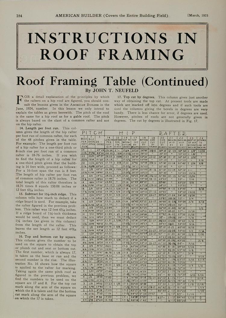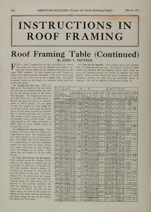 This is an original 1925 print one-page article "Instructions in Roof Framing: Roof Framing Table" by John T. Neufeld.