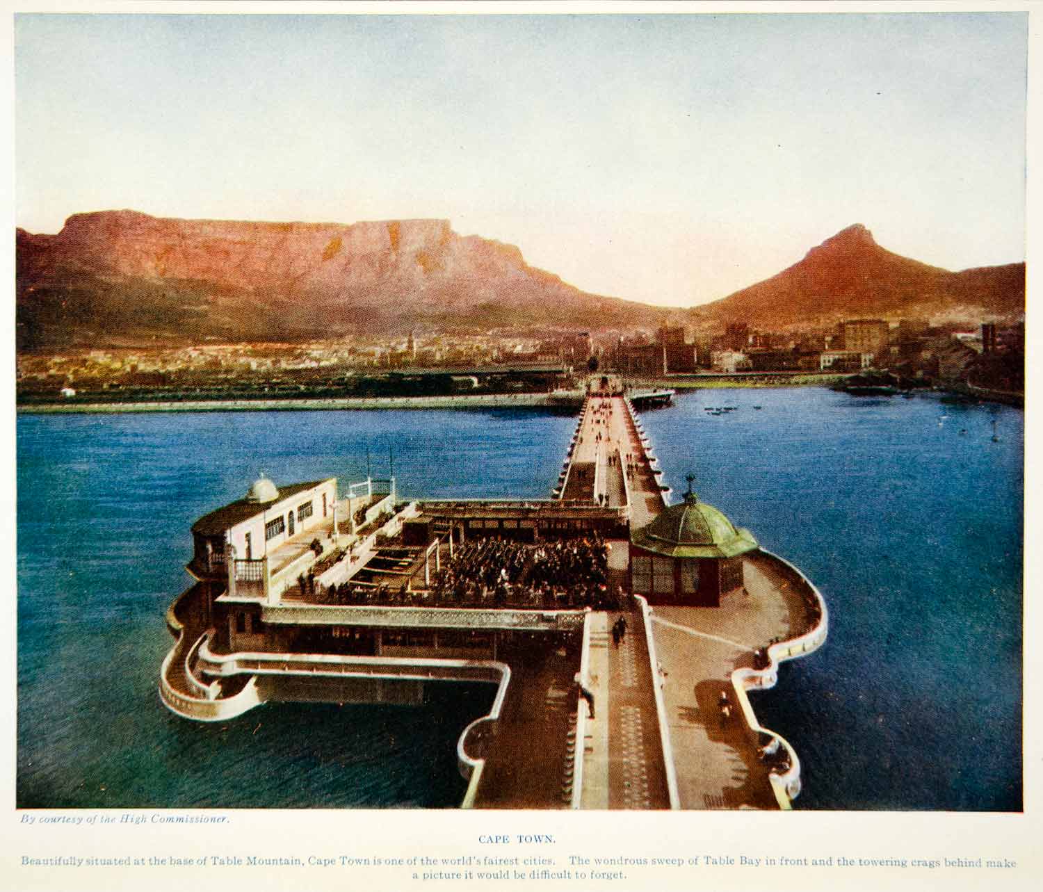 This is an original 1925 color print of Cape Town, South Africa that is located along the shores of Table Bay at the base of Table Mountain.