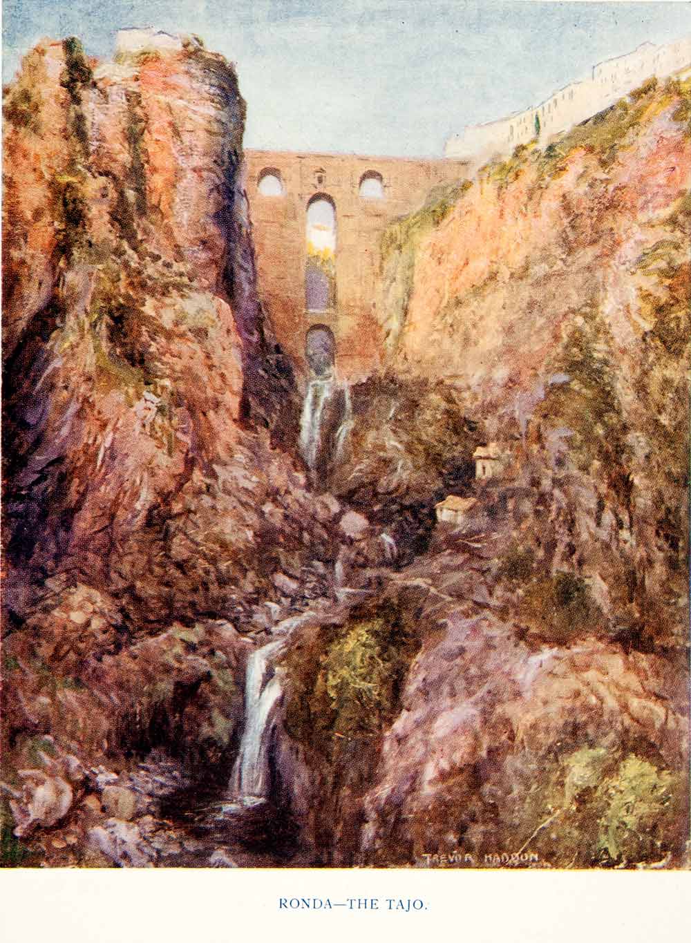 This is an original 1925 color print of the city of Ronda, Spain, and its Puente Nuevo bridge which spans the Tajo gorge. It is a 120 meter deep chasm which the Guadalevir River runs through. The bridge was begun in 1751 and claimed the lives of 50 builders.