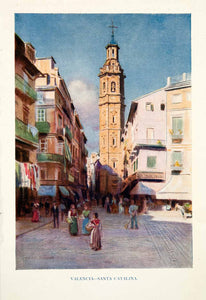 This is an original 1925 color print of the Baroque tower of the Church of Santa Catalina which is located in Valencia, Spain. The church dates from the 14th century AD but the tower was added in the 18th century AD.