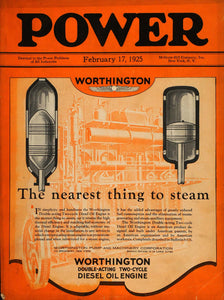 This is an original 1925 color cover for the Power Magazine, February 17, 1925, promoting the Worthington Diesel Oil Engine from Worthington Pump and Machinery Corporation located at 115 Broadway, New York.CONDITION