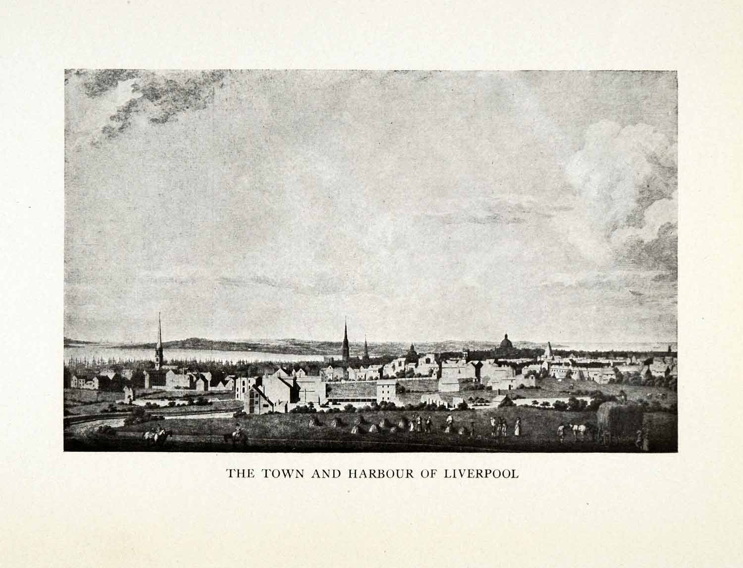 This is an original 1925 black and white halftone print of the town and harbour of Liverpool, England. In the foreground, farm hands are working vigorously.