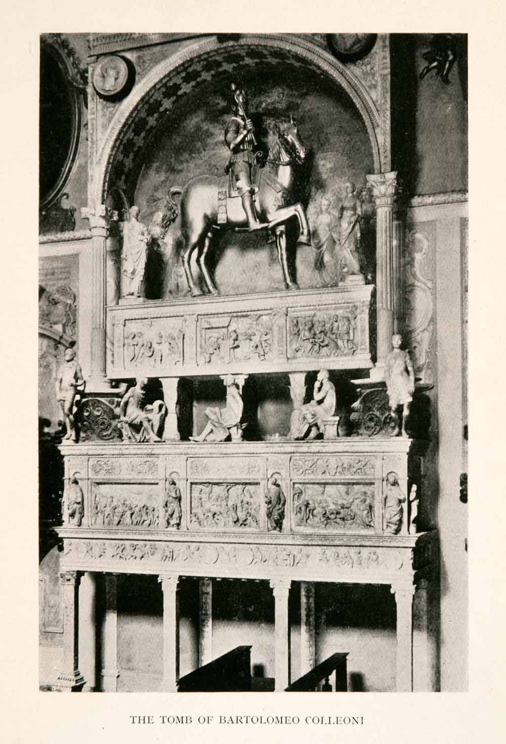 This is an original 1925 black and white halftone print of the Tomb of Bartolomeo Colleoni inside the Cappella Colleoni in Bergamo, Italy. The Tomb was built in 1472-1476 as a personal shrine for Bartolomeo Colleoni a Venetian mercenary commander who later became the Captain-General of Venice.