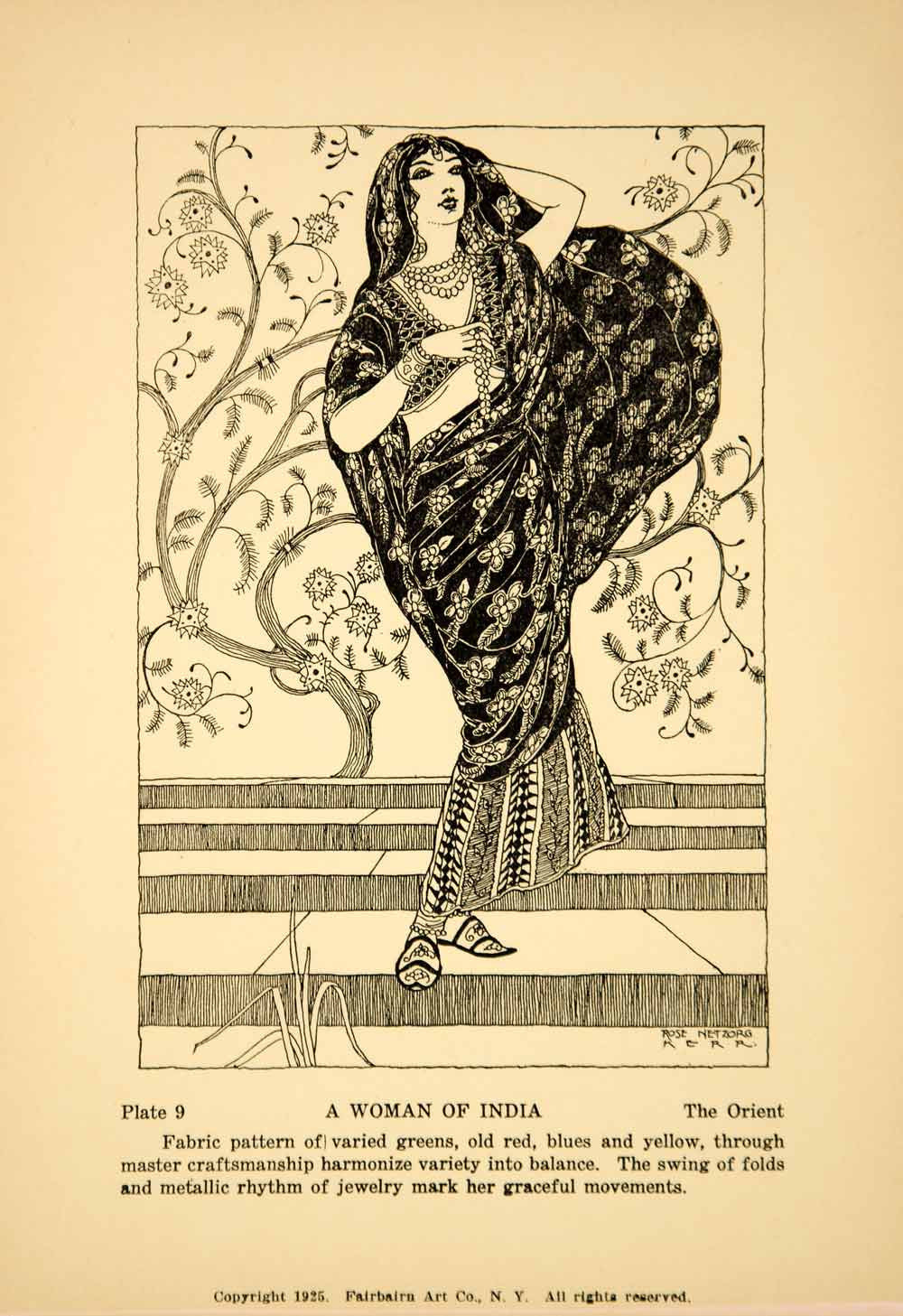 This is an original 1925 black on cream stock lithograph of an illustration by artist, Rose Netzorg Kerr (1892-1974) of the traditional dress of an Indian woman.