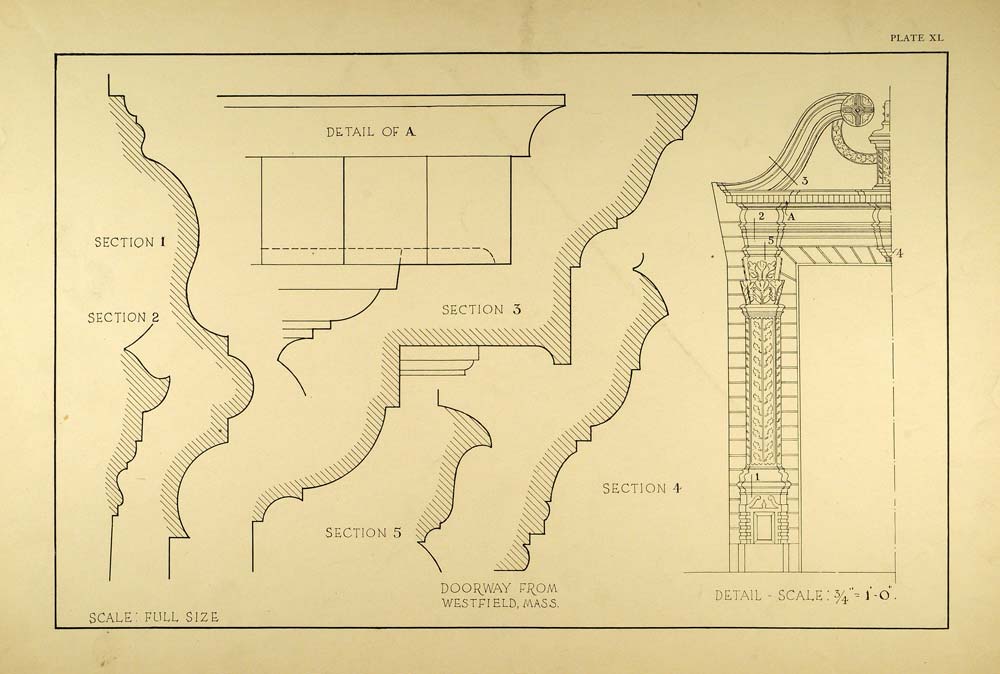 Keywords specific to this image: architecture, architect, exterior, interior, decor, decorative, decorating, plan, planning, layout, blueprint, art, design, designer, designing, pillar, ornamental, mold, motif, neoclassical, architectonics, structure, structural, door, frame, framing, wood, woodwork, pediment, scroll, floral, flowers, botanical, detail, detailing, scale, section