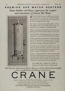 This is an original 1925 black and white print ad for the Crane Premier Automatic and Insulated Water Heater.