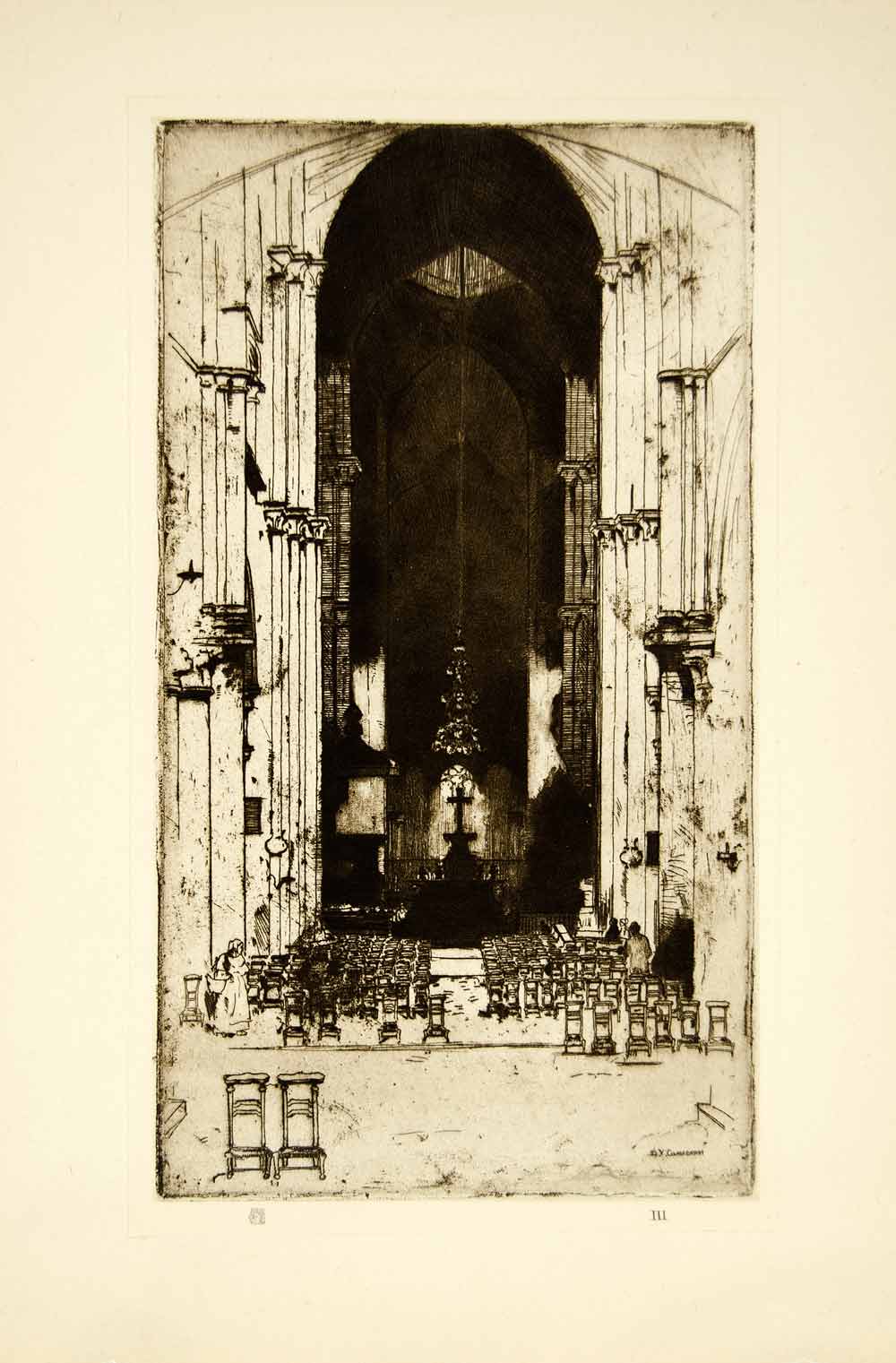 This is an original 1925 tipped-in black and white photogravure of an etching by the Scottish painter and etcher, Sir David Young Cameron (1865-1945) of the interior of the 12th century Église Saint-Nicolas-Saint-Laumer in Blois, France.