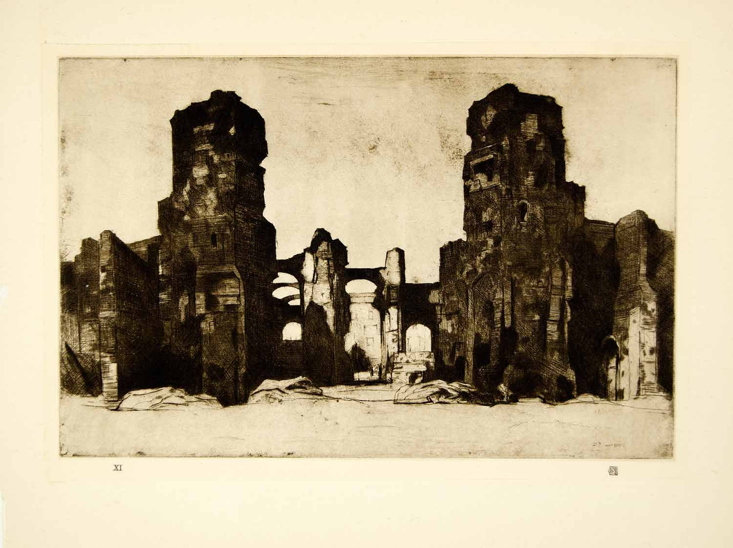This is an original 1925 tipped-in black and white photogravure of an etching by the Scottish painter and etcher, Sir David Young Cameron (1865-1945) of the ruins of the Baths of Caracalla (Terme di Caracalla) in Rome, Italy. Built in the early 3rd century, they were the second largest of the Roman public baths, or thermae.