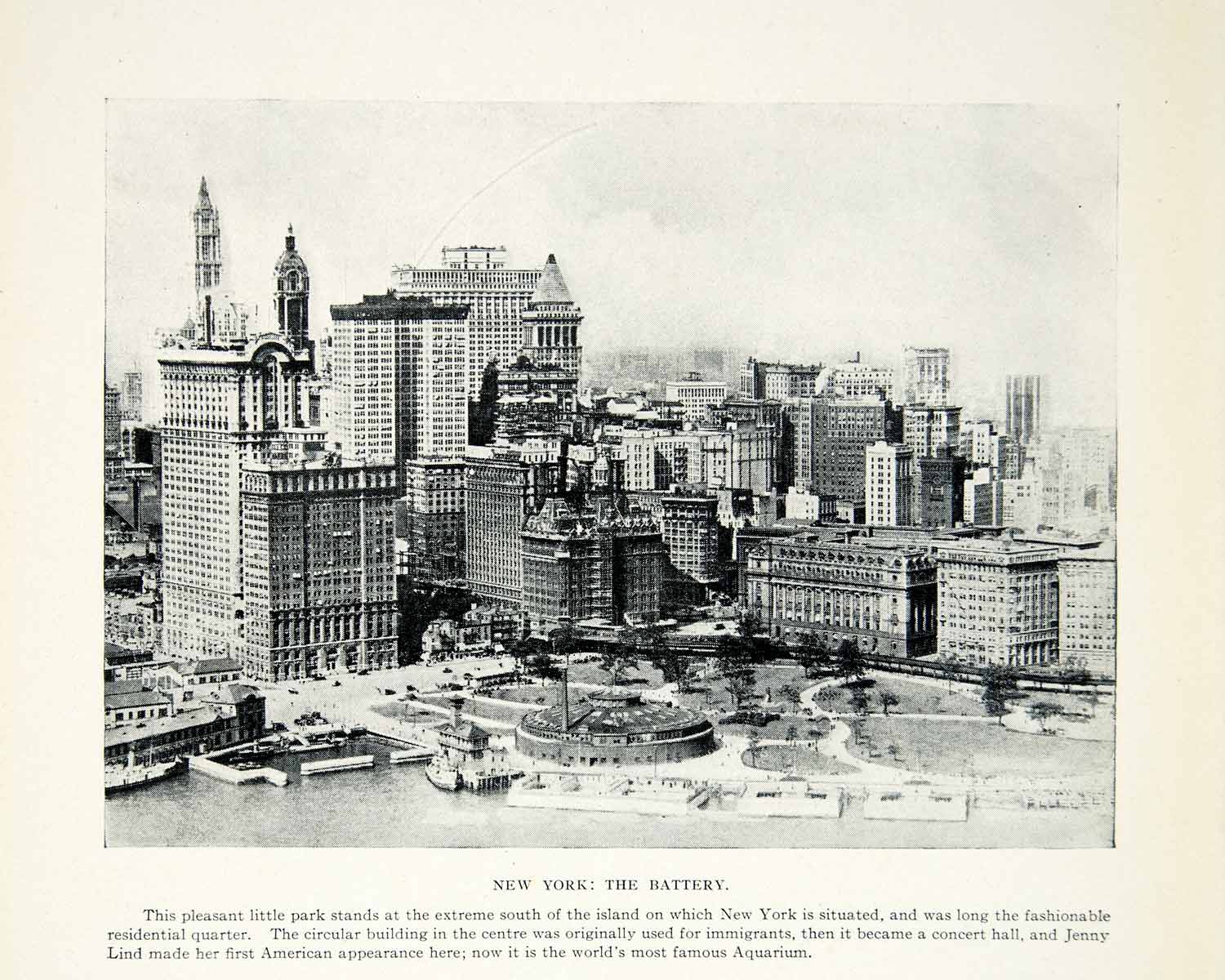 This is an original 1925 black and white halftone print of a historic photograph of Battery Park on Manhattan Island, New York, NY.