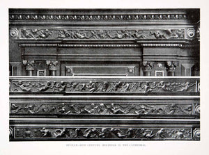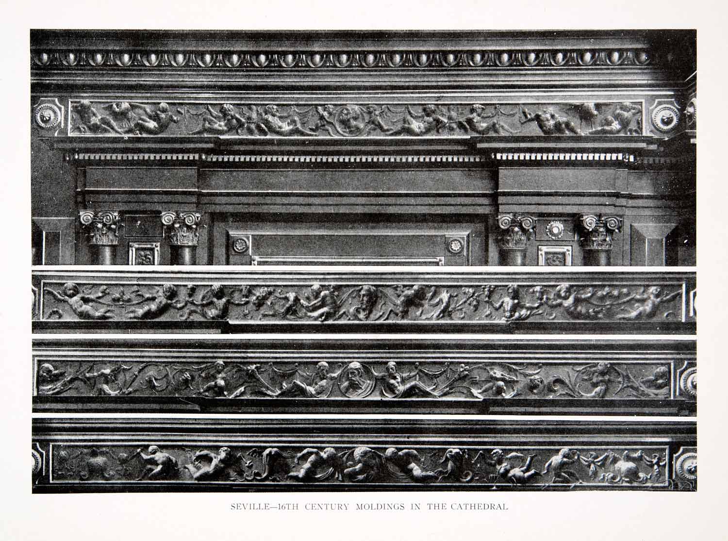 This is an original 1925 black and white halftone print of 16th century crown moldings in the Cathedral in Seville, Spain. The top image shows the molding as it is seen from the cameraman and the bottom image shows numerous close-up details of the carvings.