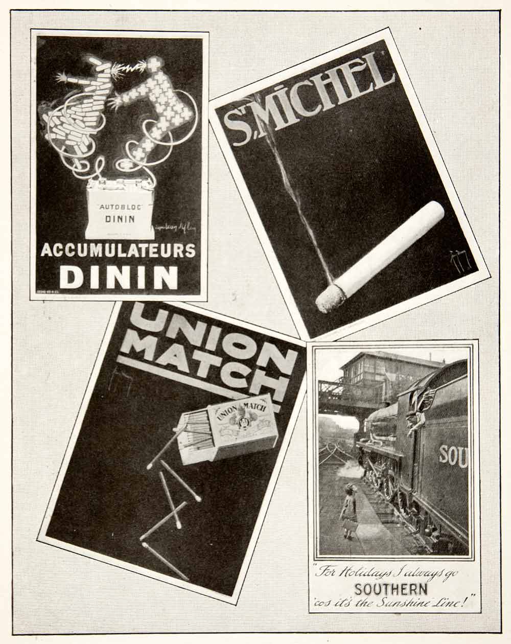 This is an original 1925 black and white halftone print of four unique advertisements. Clockwise, from the top left: Dinin accumulators or batteries; St. Michel cigarettes, Southern railway line, and matchbox label Union Match.