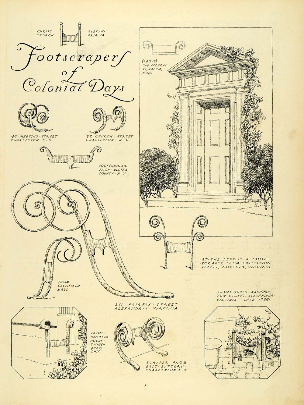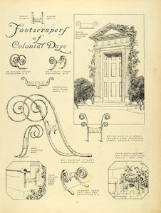 This is an original 1925 halftone print of various footscrapers of colonial days. Shown are footscrapers from Christ Church of Alexandria, Virginia; 48 Meeting Street of Charleston, South Carolina; 92 Church Street of Charleston, South Carolina; a footscraper from Ulster County, New York; from Deerfield, Massachusetts; from 211 Fairfax Street of Alexandria, Virginia; from Freemason Street of Norfolk, Virginia; from North Washington Street of Alexandria, Virginia; a scraper from East Battery, Charleston, South Carolina; and from the Herrick House of Twinsburg, Ohio.