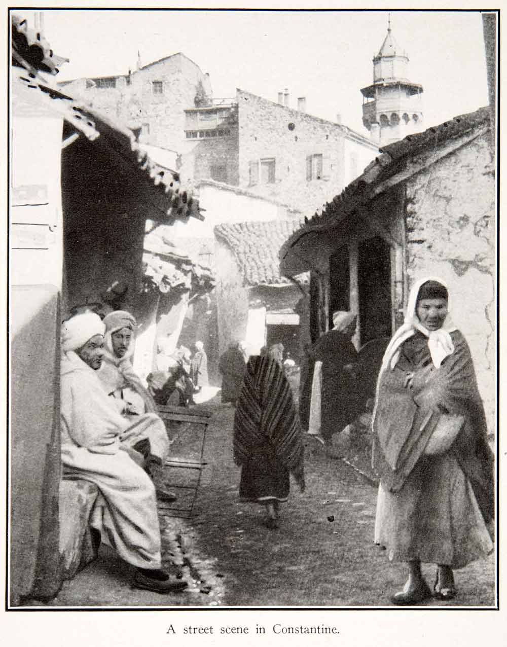 This is an original 1925 black and white halftone print of a historic image of a street scene in Constantine, Algeria.