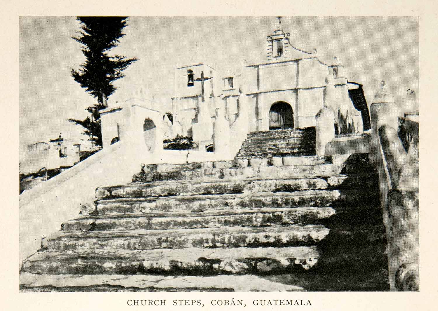 This is an original 1925 black and white halftone print of the El Calvario Church in the city of Cobán in the country of Guatemala in Central America. Cobán is in the region of Alta Verapaz. It was built on a site where a hunter saw a vision of Jesus Christ instead of killing two jaguars.