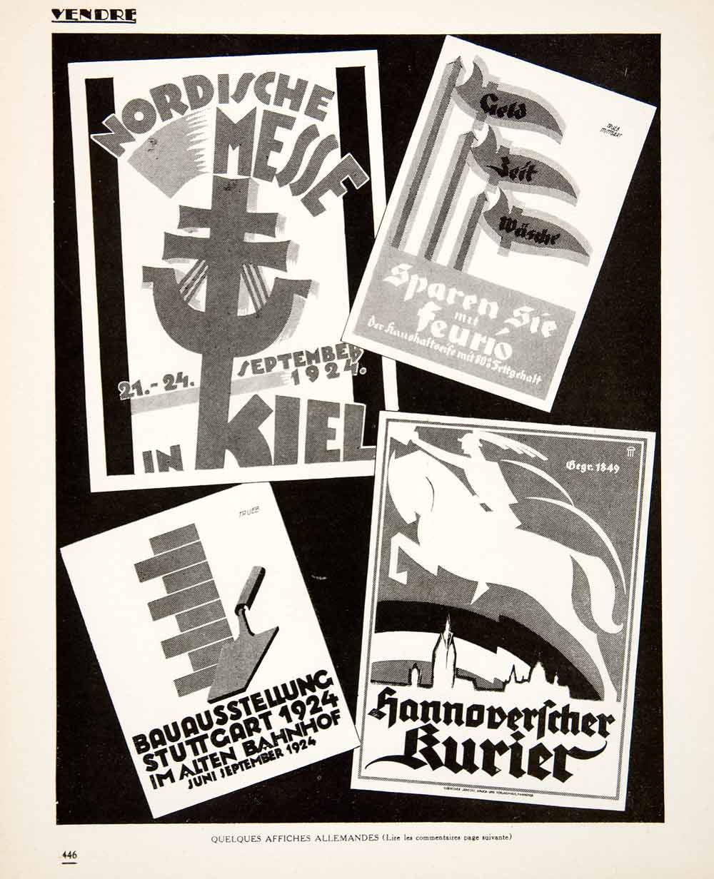 This is an original 1925 black and white halftone print of four pieces of German advertising. From the top, clockwise: Nordische Messe (Nordic Trade Show) in Kiel, Feurio soap, Hannoverscher Kurier (Hanoverian Courier), and the Bauausstellung in Stuttgart (Building Exhibition).