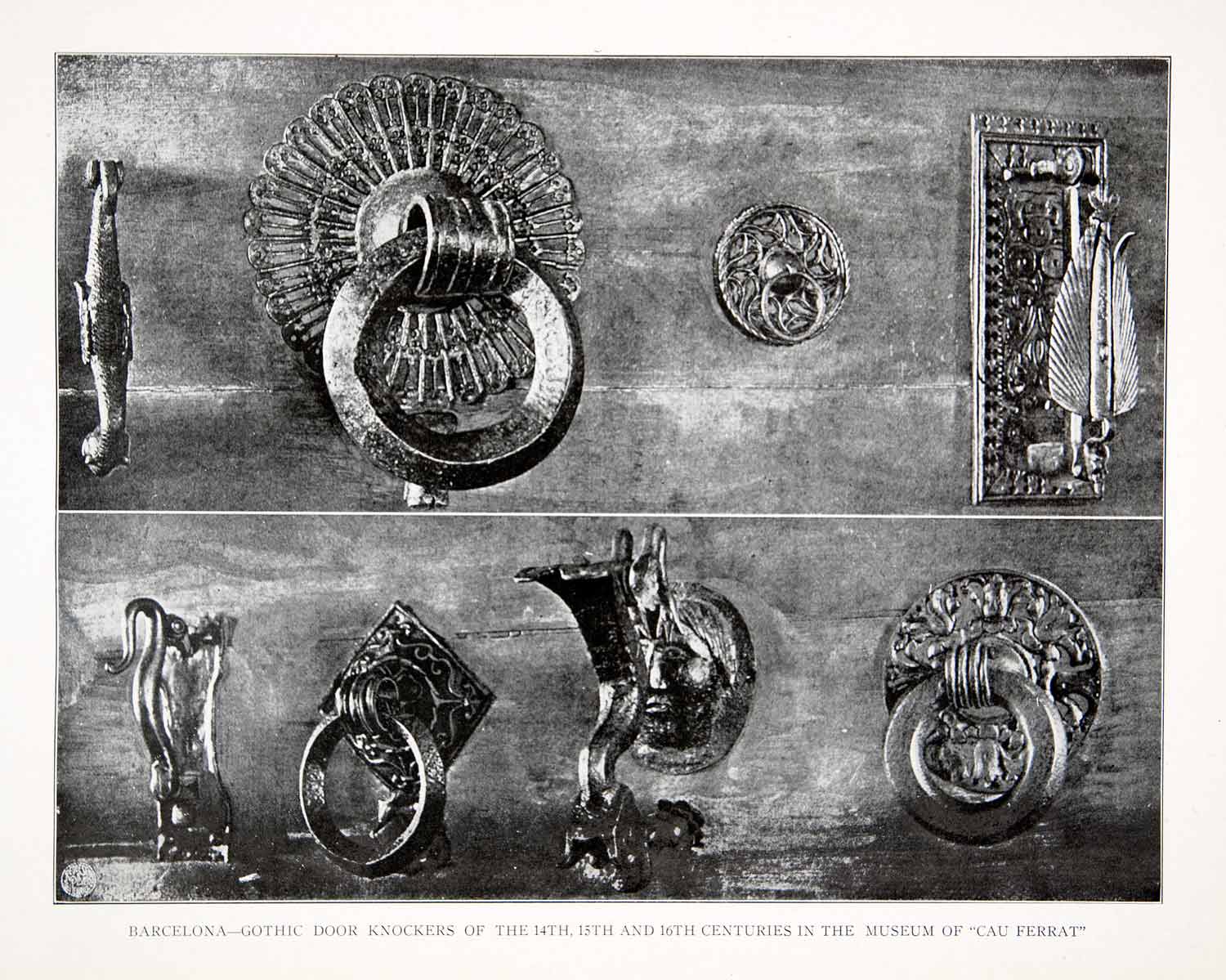 This is an original 1925 black and white halftone print of Gothic door knockers from the 14th-16th centuries from inside the Museum "Cau Ferrat" in Barcelona, Spain.