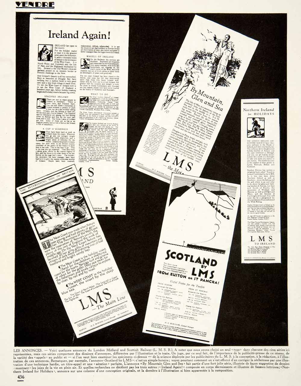 This is an original 1925 black and white halftone print of five advertisements used to explore different advertising styles of the time. They are for the London Midland and Scottish Railway, all promoting the unique qualities of Ireland, the Isle of Man, Briton's west coast, Northern Ireland, and Scotland as great holiday destinations.