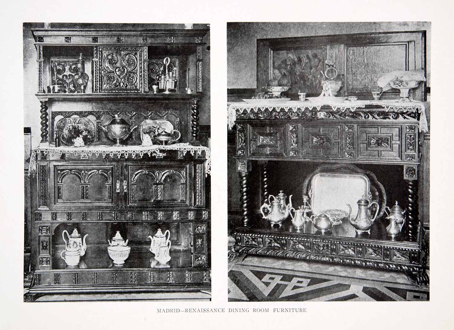 This is an original 1925 black and white halftone print of a Renaissance dining room and furniture from the 17th century in Madrid, Spain.