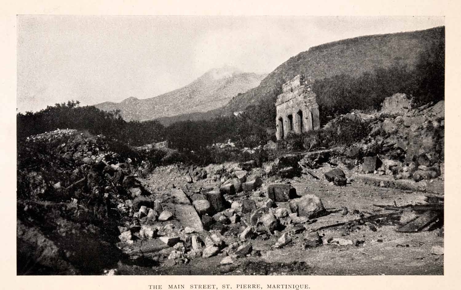 This is an original 1925 halftone print of the rubble which remained in the main street of St. Pierre, Martinique, after the devastating 1902 volcanic eruption which partially buried the town.