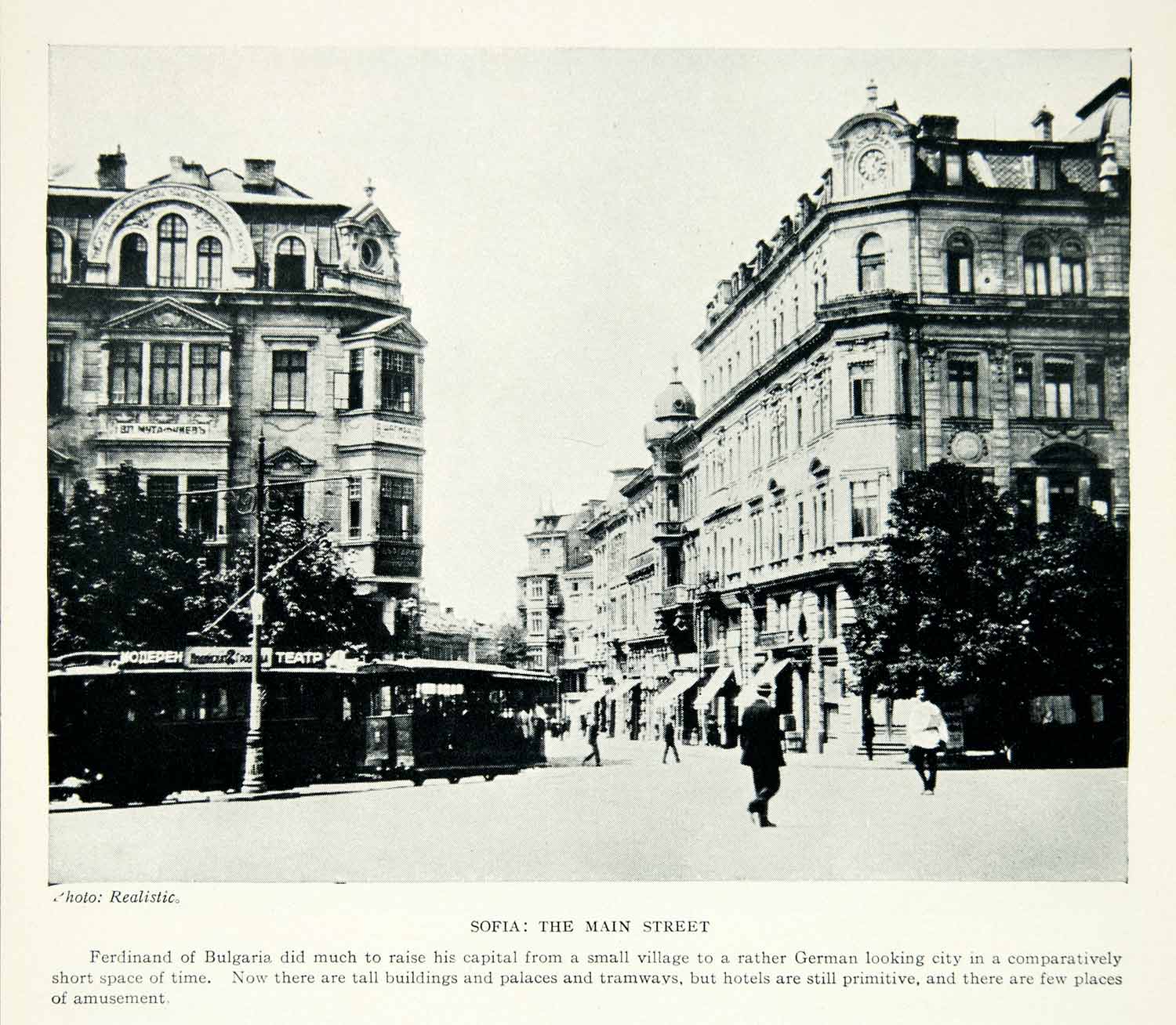 This is an original 1925 black and white halftone print of a historic cityscape of Sofia, Bulgaria in Europe along one of its main streets.