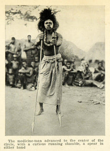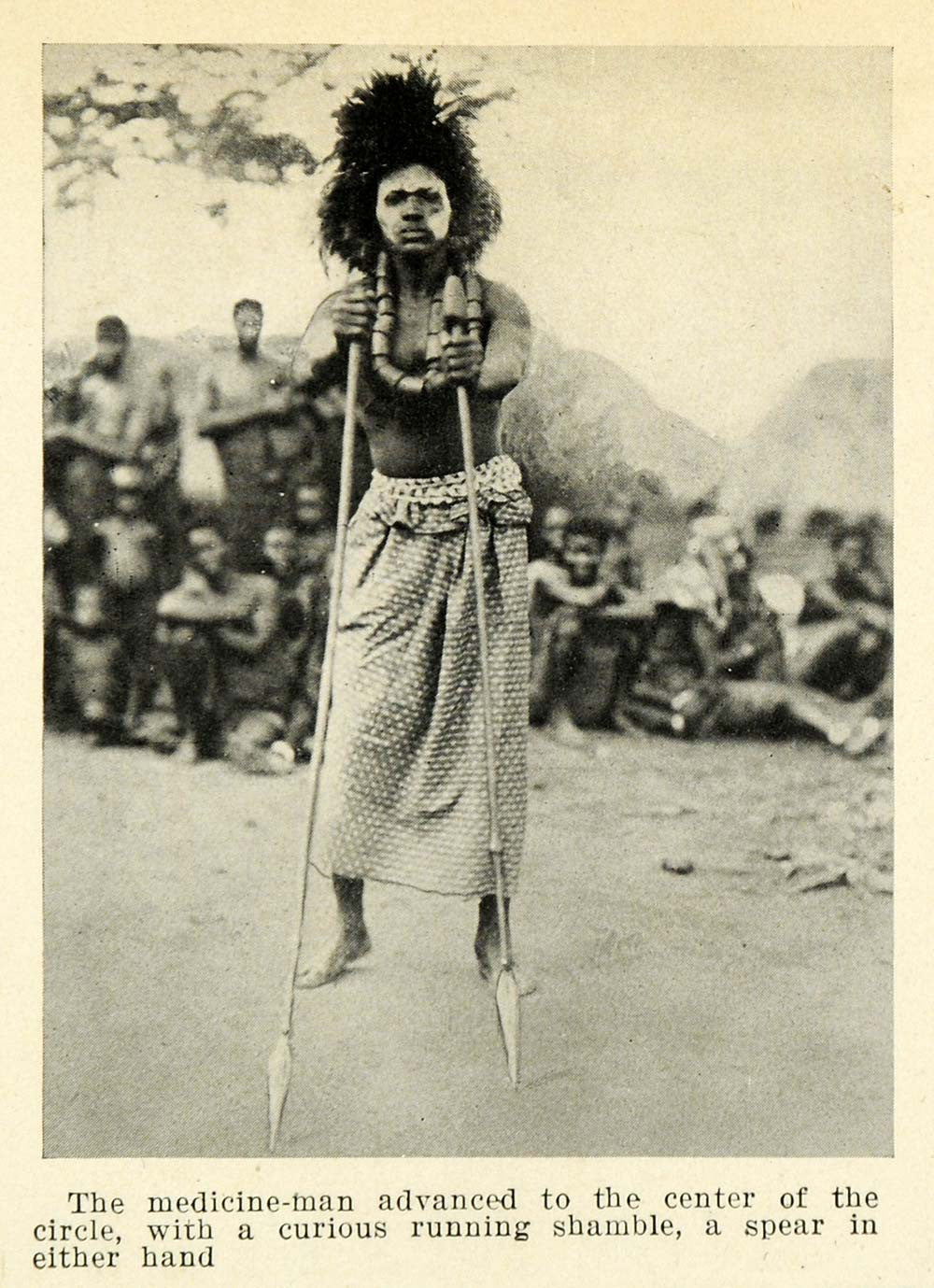 This is an original 1925 halftone print of a medicine man of the Democratic Republic of the Congo. The caption writes, "The medicine-man advanced to the center of the circle, with a curious running shamble, a spear in either hand." Please note the dimensions of this image.