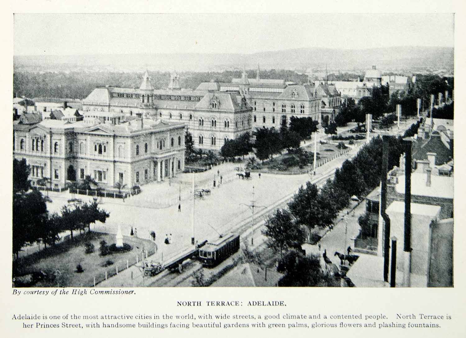 This is an original 1925 black and white halftone print of a historic cityscape of Adelaide, South Australia along North Terrace.