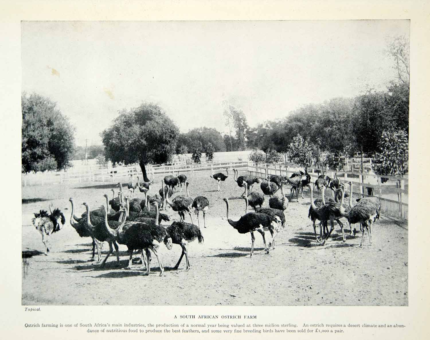This is an original 1925 black and white halftone print of an ostrich farm in South Africa.