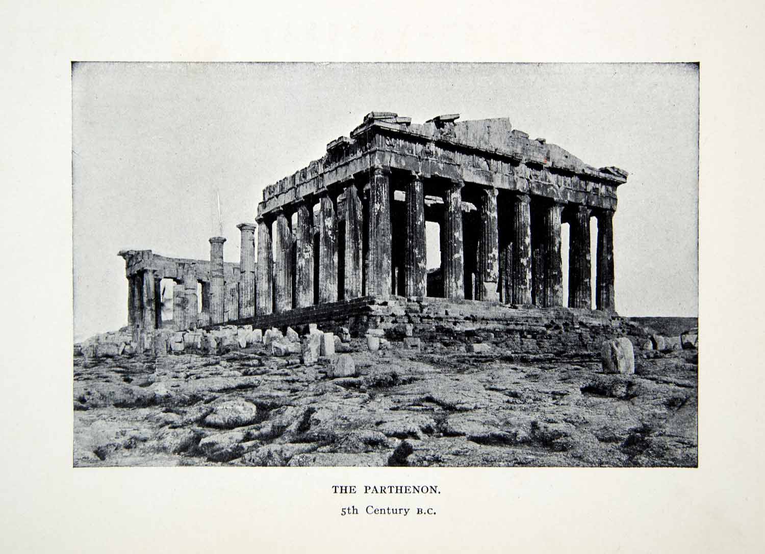 This is an original 1925 black and white halftone print of the Parthenon in Athens, Greece. It is dedicated to the Greek Goddess Athena.
