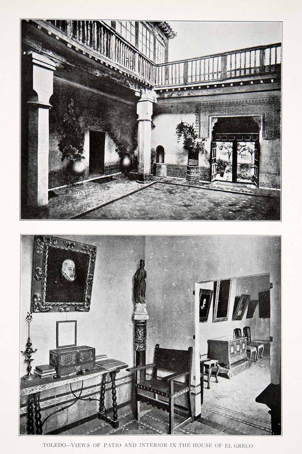 This is an original 1925 black and white halftone print of the interior and patio of the El Greco's house in Toldeo, Spain. El Greco was a famous painter from Crete who lived and died in Toledo.