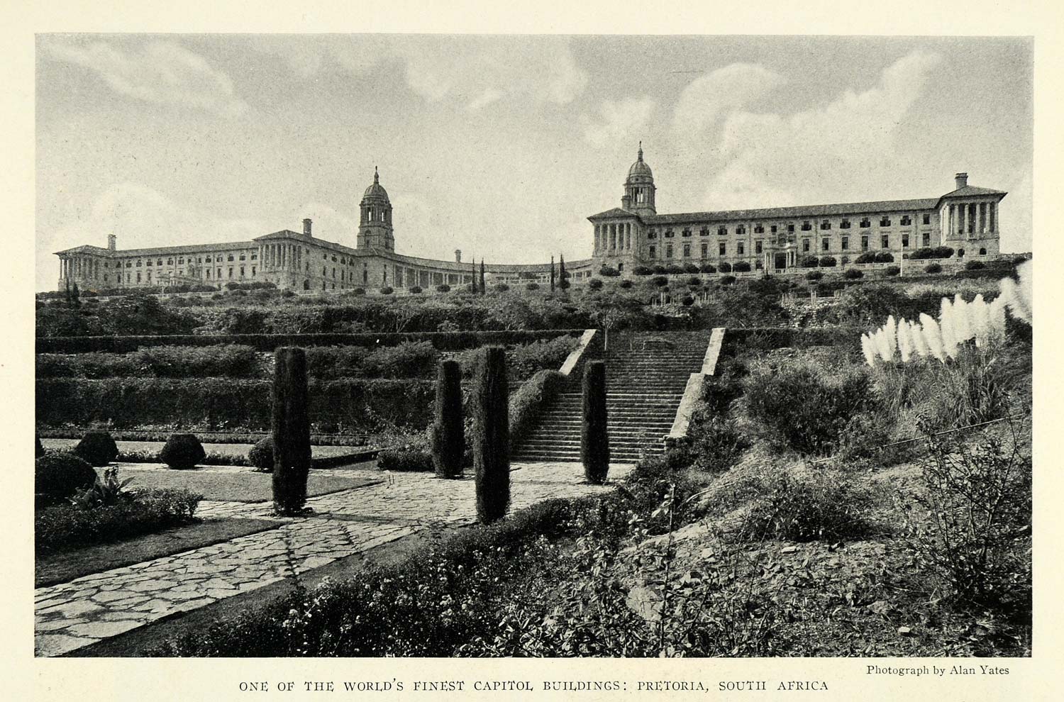 This is an original 1925 halftone print of the Pretoria capitol building of South Africa, which houses the administrative and executive part of the South African government. Also visible is the terraced Italian garden, and the curved colonnade that connects the two large wings. Photography by Alan Yates.