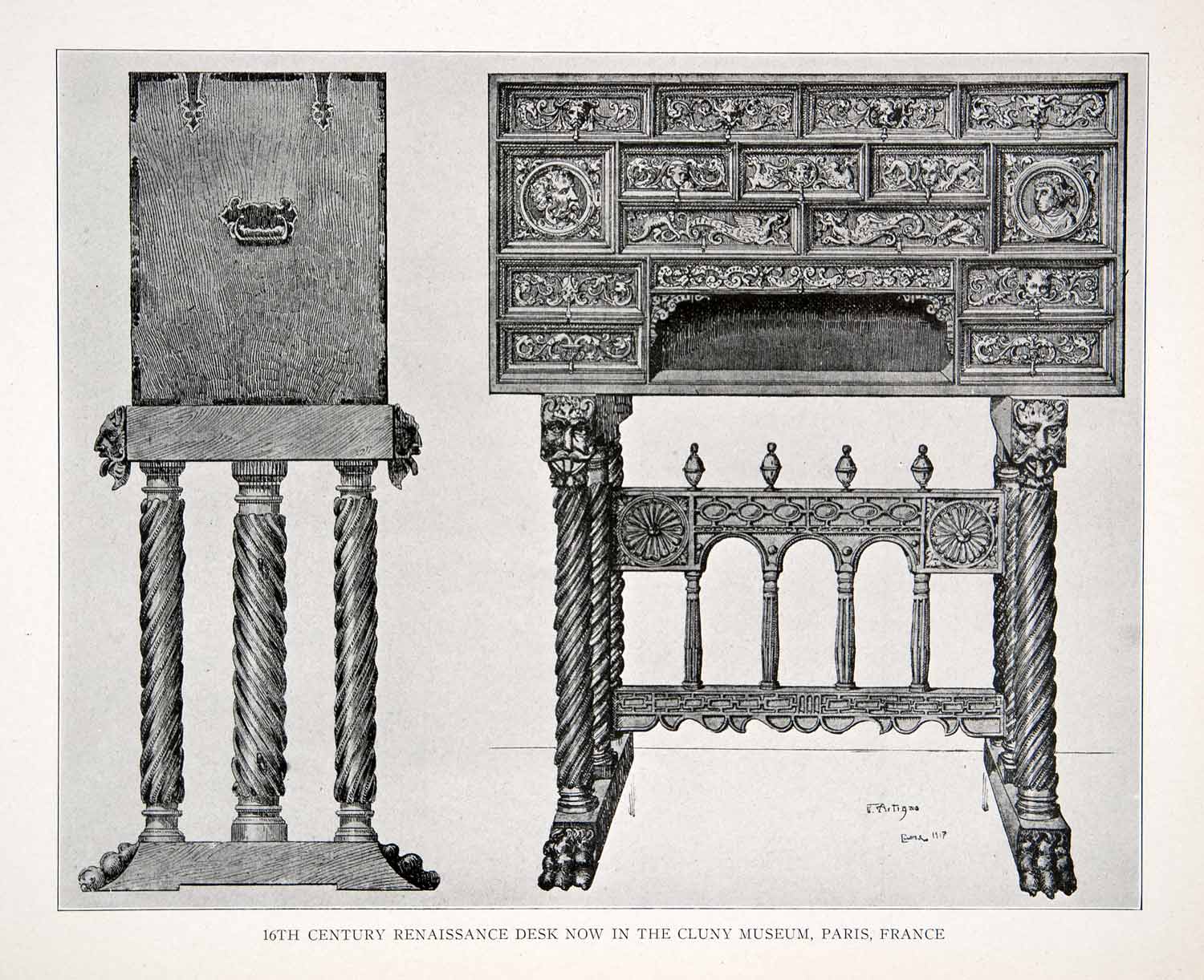 This is an original 1925 black and white halftone print of a Renaissance desk from Spain that is now in the Cluny Museum in Paris, France.