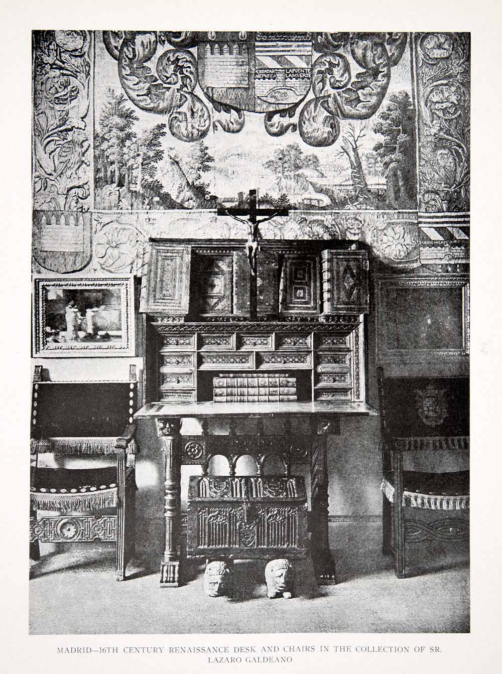 This is an original 1925 black and white halftone print of a 16th century Renaissance desk and chair in the collection of Sr. Lazaro Galdeano in Madrid, Spain.