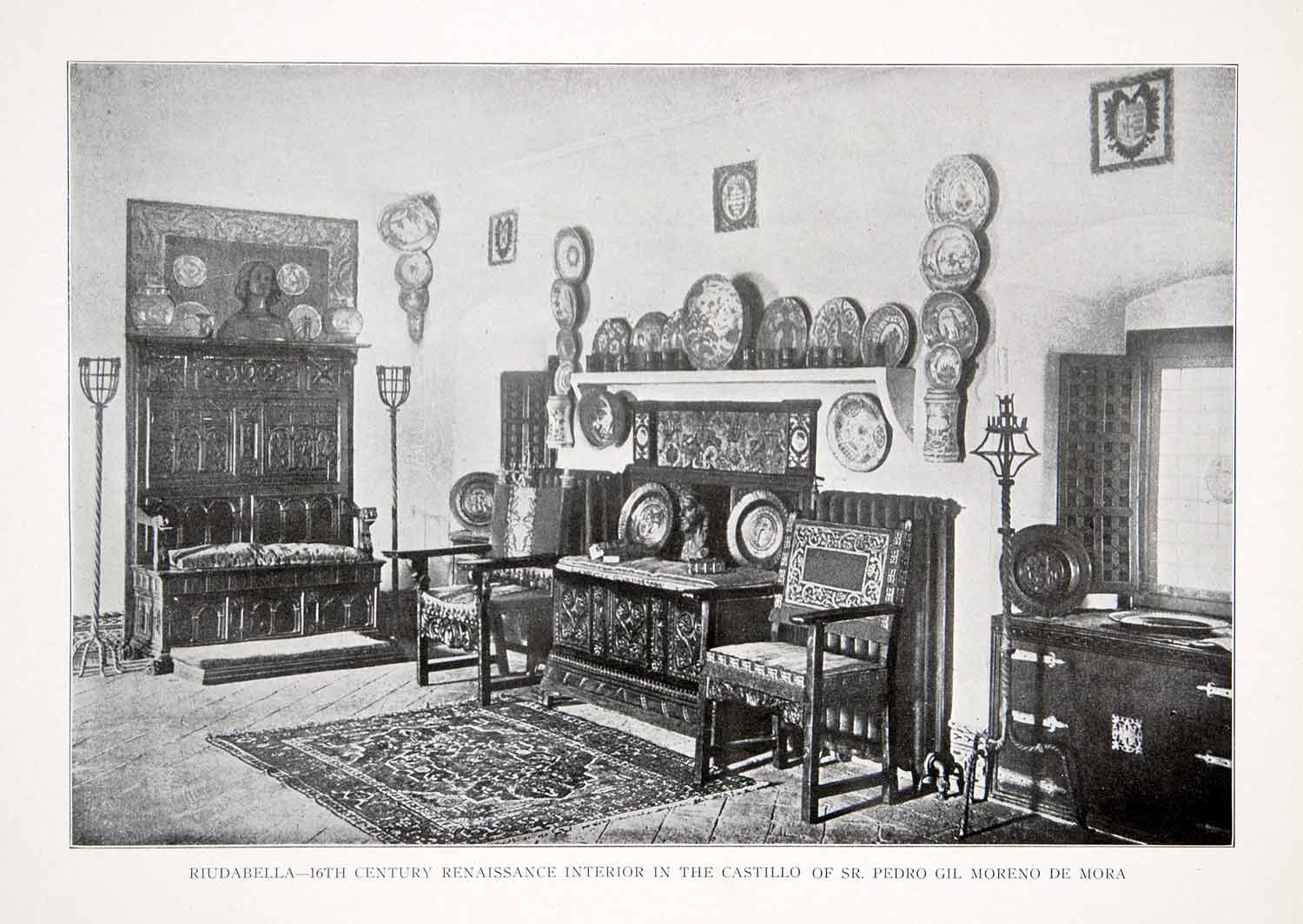 This is an original 1925 black and white halftone print of the Renaissance interior of the Castillo de Sr. Pedro Gil Moreno de Mora in Riudabella, Spain.