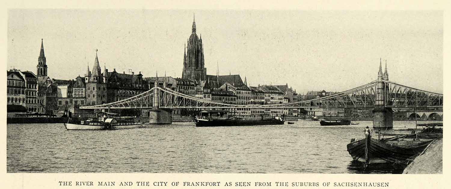 This is an original 1925 halftone print of the River Main and the city of Frankfort in Germany.