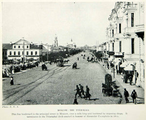 This is an original 1925 black and white halftone print of a historic cityscape of Moscow, Russia along Tverskaya Street.