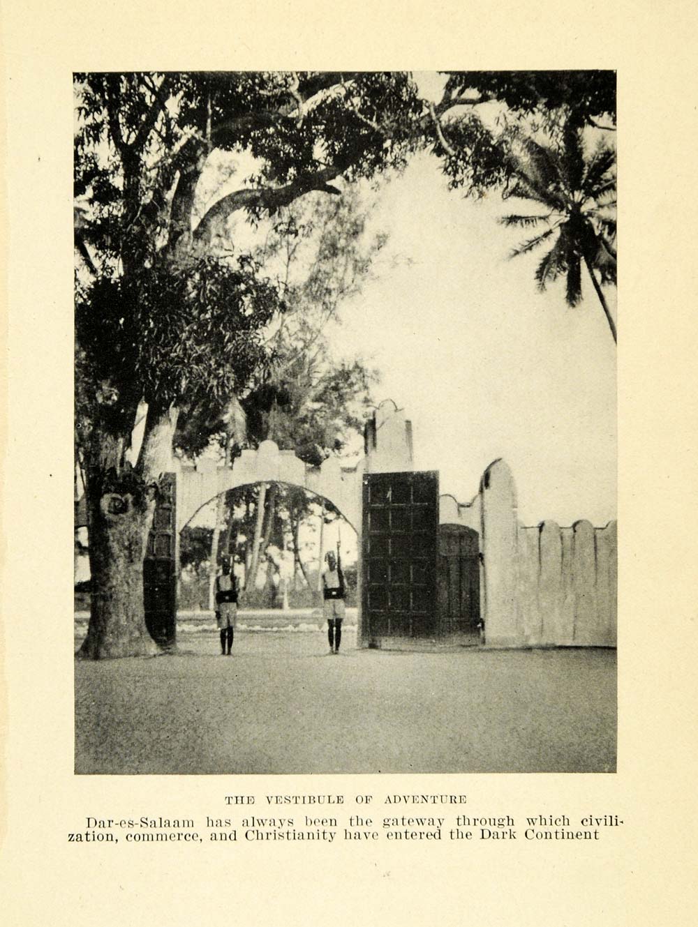 This is an original 1925 halftone print of a gateway in Dar es Salaam, Tanzania. Dar es Salaam is currently the country's richest city, and an important economic center.