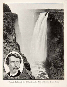 This is an original 1925 black and white halftone print of Victoria Falls in Africa with an inset portrait of Dr. David Livingstone, the first white man to see the majestic waterfall in person.