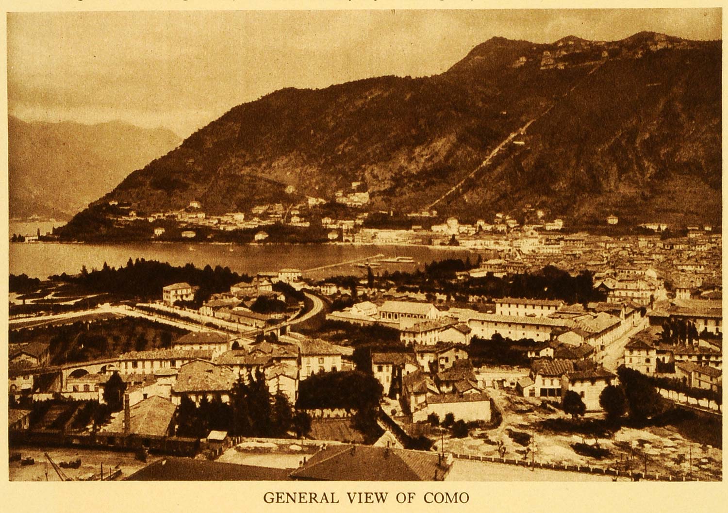 This is an original 1925 sepia Rotogravure of Como, Italy. Como is located on Lake Como and the Alps, and has become a popular tourist destination due to its numerous works of art, museums, and gardens.